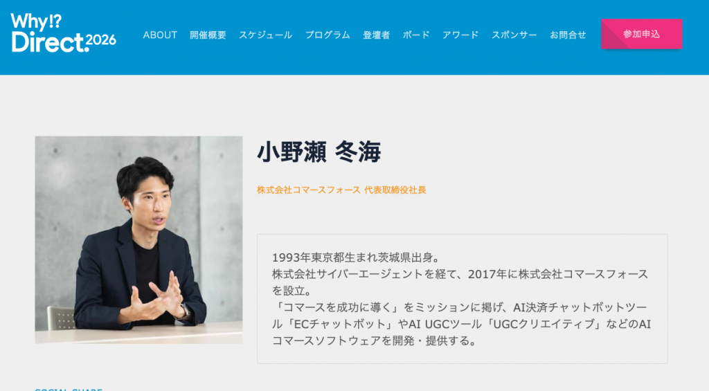 株式会社コマースフォース(本社:東京都新宿区、代表取締役社長:小野瀬冬海、以下:コマースフォース)は、2026年2月18-20日、福岡アイランドシティフォーラムにて開催される、日本最大級のD2C・EC合宿型カンファレンス「Why!? Direct.2026」に弊社代表取締役社長の小野瀬冬海が登壇致します。Why!? Direct.(旧D2Cサミット)での講演は、2023年以来の2度目の登壇となります。当日は、コマースフォースの新プロダクトであるEFO&AI決済チャットボットツール「ECチャットボット」の最新事例を公開致します。ぜひご来場くださいませ。