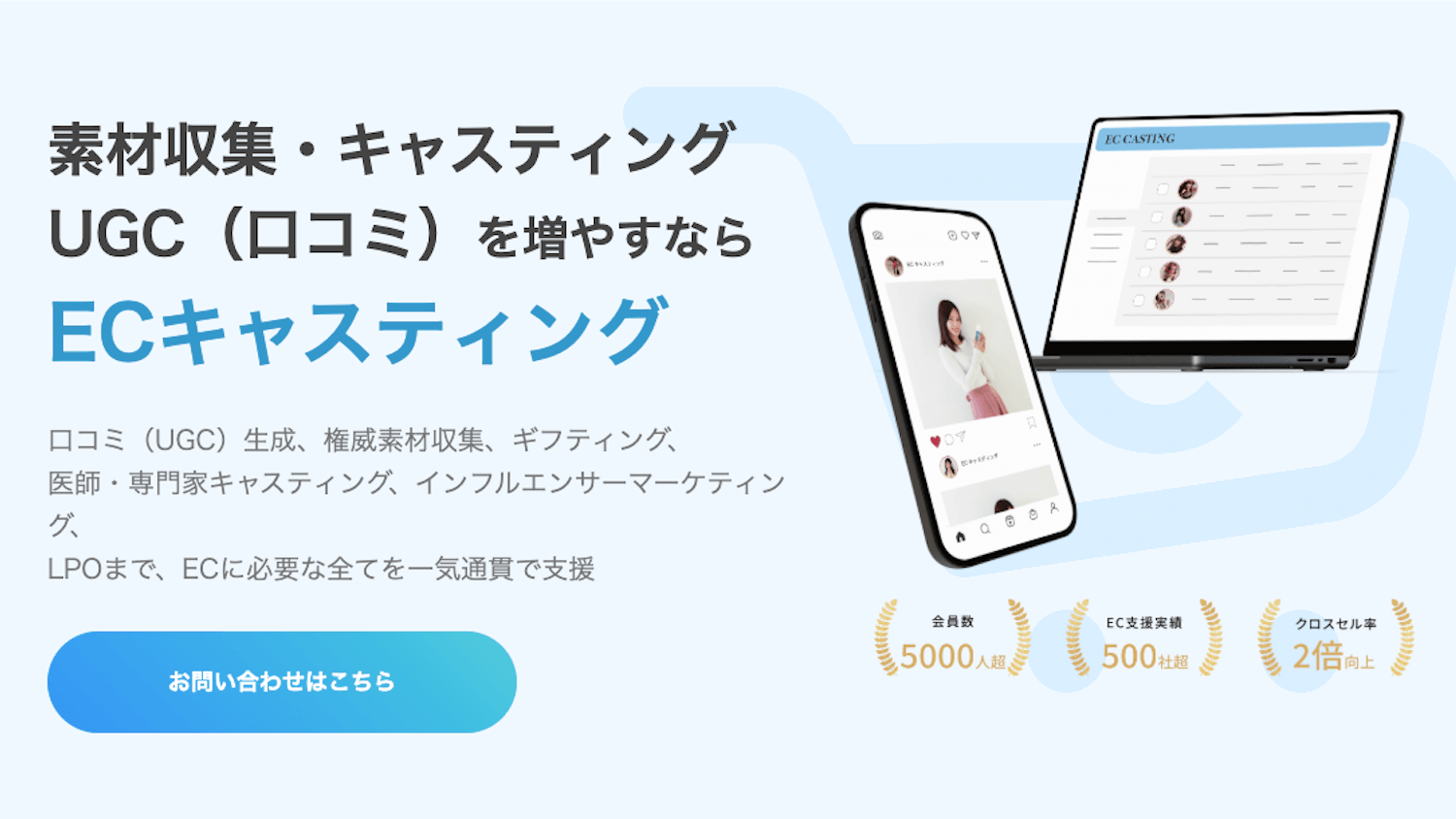 ECキャスティングは、6000人超のインフルエンサー/モニター/専門家などの会員を保有し、SNS投稿やレビューなどの良質な口コミ(UGC)を増やすギフティングから、インフルエンサー・モデル・医師・専門家などのキャスティング、ECサイトやLPに必要な権威付けの素材収集まで可能なLPOツールです。